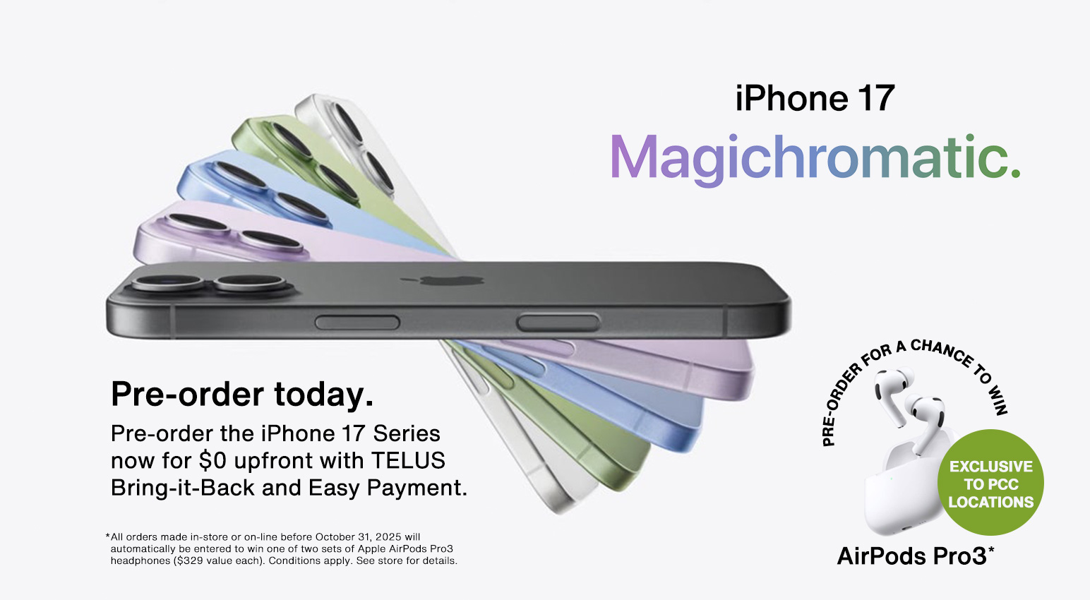 "*" indicates required fields FacebookThis field is for validation purposes and should be left unchanged.Name*Email*Phone*TELUS customer*YesNoSales Rep NamePick up Location*Abbotsford – Highstreet, BCAbbotsford – Sumas Way Location, BCBurnaby, BCChilliwack, BCDuncan (Canada Ave), BCDuncan (Cowichan Commons), BCLangley – 66th Ave Location, BCLangley (Walnut Grove), BCKelowna – Springfield Rd, BCKelowna (Spall Plaza), BCMaple Ridge, BCPenticton, BCSalmon Arm, BCVancouver – Cambie Street Location, BCVancouver (West Broadway), BCVernon, BCCalgary – Deerfoot City, ABCalgary – Aspen Landing Shopping Centre, ABEdmonton, ABAbbotsford – Highstreet TELUS & KOODOPhoneAbbotsford – Sumas Way TELUS & KOODOPhoneBurnaby TELUS & KoodoPhoneChilliwack TELUS & KoodoPhoneDuncan (Canada Ave) TELUS & KoodoPhoneDuncan (Cowichan Commons) TELUS & KOODOPhoneLangley – 66th Ave Location TELUS & KoodoPhoneLangley (Walnut Grove) TELUS & KoodoPhoneKelowna (Springfield Rd) TELUS & KoodoPhoneKelowna (Spall Plaza)PhoneMaple Ridge TELUS & KoodoPhonePenticton TELUS & KoodoPhoneStore Salmon Arm (Piccadilly Mall) TELUS & KoodoPhoneVancouver Cambie Street TELUS & KoodoPhoneVancouver (West Broadway) TELUS & KoodoPhoneVernon TELUS & KoodoPhoneCalgary – Deerfoot City TELUS & KoodoPhoneCalgary – Aspen Landing Shopping Centre TELUS & KoodoPhoneEdmonton – Parsons Road TELUS & KoodoPhoneiPhone 17iPhone 17, 256GBiPhone 17, 512GBColourLavender – 256GB, 512GBSage – 256GB, 512GBMist Blue – 256GB, 512GBWhite – 256GBBlack – 256GB, 512GBQuantityadd1 Add More iPhone 17iPhone 17, 256GBiPhone 17, 512GBColourLavender – 256GB, 512GBSage – 256GB, 512GBMist Blue – 256GB, 512GBWhite – 256GBBlack – 256GB, 512GBQuantityadd2 Add More iPhone 17iPhone 17, 256GBiPhone 17, 512GBColourLavender – 256GB, 512GBSage – 256GB, 512GBMist Blue – 256GB, 512GBWhite – 256GBBlack – 256GB, 512GBQuantityiPhone AiriPhone Air, 256GBiPhone Air, 512GBiPhone Air, 1TBColourSky Blue – 256GB, 512GBLight Gold – 256GB, 512GBCloud White – 256GBSpace Black – 256GB, 512GB, 1TBQuantityadd3 Add More iPhone AiriPhone Air, 256GBiPhone Air, 512GBiPhone Air, 1TBColourSky Blue – 256GB, 512GBLight Gold – 256GB, 512GBCloud White – 256GBSpace Black – 256GB, 512GB, 1TBQuantityadd4 Add More iPhone AiriPhone Air, 256GBiPhone Air, 512GBiPhone Air, 1TBColourSky Blue – 256GB, 512GBLight Gold – 256GB, 512GBCloud White – 256GBSpace Black – 256GB, 512GB, 1TBQuantityiPhone 17 ProiPhone 17 Pro, 256GBiPhone 17 Pro, 512GBiPhone 17 Pro, 1TBColourSilver – 256GB, 512GB, 1TBCosmic Orange – 256GB, 512GB, 1TBDeep Blue – 256GB, 512GB, 1TBQuantityadd5 Add More iPhone 17 ProiPhone 17 Pro, 256GBiPhone 17 Pro, 512GBiPhone 17 Pro, 1TBColourSilver – 256GB, 512GB, 1TBCosmic Orange – 256GB, 512GB, 1TBDeep Blue – 256GB, 512GB, 1TBQuantityadd6 Add More iPhone 17 ProiPhone 17 Pro, 256GBiPhone 17 Pro, 512GBiPhone 17 Pro, 1TBColourSilver – 256GB, 512GB, 1TBCosmic Orange – 256GB, 512GB, 1TBDeep Blue – 256GB, 512GB, 1TBQuantityiPhone 17 Pro MaxiPhone 17 Pro Max, 256GBiPhone 17 Pro Max, 512GBiPhone 17 Pro Max, 1TBiPhone 17 Pro Max, 2TBColourSilver – 256GB, 512GB, 1TBCosmic Orange – 256GB, 512GB, 1TB, 2TBDeep Blue – 256GB, 512GB, 1TBQuantityadd7 Add More iPhone 17 Pro MaxiPhone 17 Pro Max, 256GBiPhone 17 Pro Max, 512GBiPhone 17 Pro Max, 1TBiPhone 17 Pro Max, 2TBColourSilver – 256GB, 512GB, 1TBCosmic Orange – 256GB, 512GB, 1TB, 2TBDeep Blue – 256GB, 512GB, 1TBQuantityadd8 Add More iPhone 17 Pro MaxiPhone 17 Pro Max, 256GBiPhone 17 Pro Max, 512GBiPhone 17 Pro Max, 1TBiPhone 17 Pro Max, 2TBColourSilver – 256GB, 512GB, 1TBCosmic Orange – 256GB, 512GB, 1TB, 2TBDeep Blue – 256GB, 512GB, 1TBQuantity * All orders made in-store or on-line before October 31, 2025 will automatically be entered to win one of two sets of Apple AirPods Pro3 headphones ($329 value each). Conditions apply. See store for details. CAPTCHA